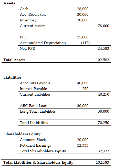 You have prepared a completed balance sheet when you have ordered the three components of the balance sheet and put them together. Notice that the sum of total assets is equal to the sum of total liabilities and total shareholders’ equity.