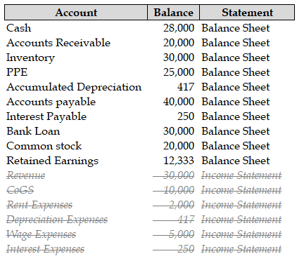 Note that the retained earnings matches the net income from the income statement because the net income is transferred to the retained earnings. The net income matches the retained earnings only because this is the first year of operations. In subsequent years the net income is added to the retained earnings balance and so the retained earnings will not match the net income of each year.